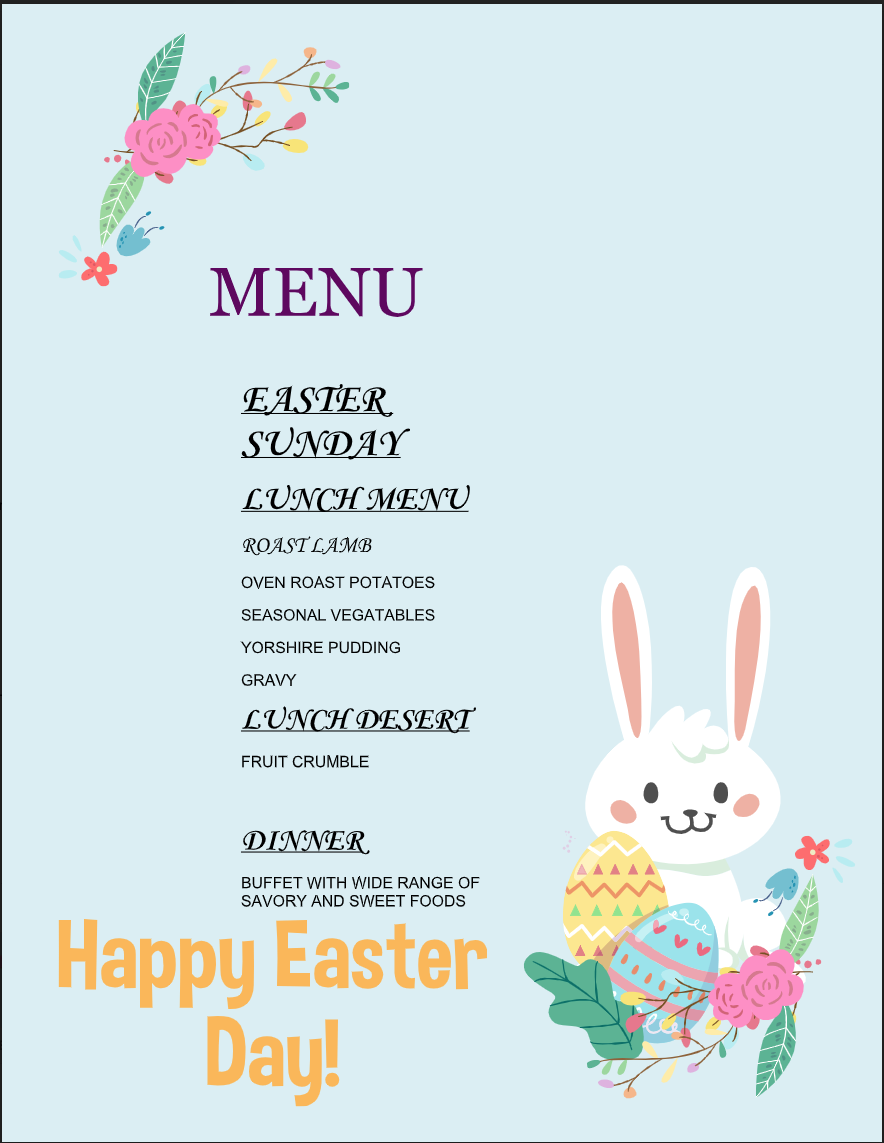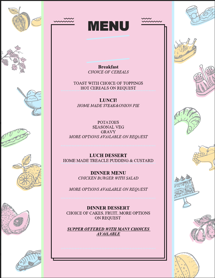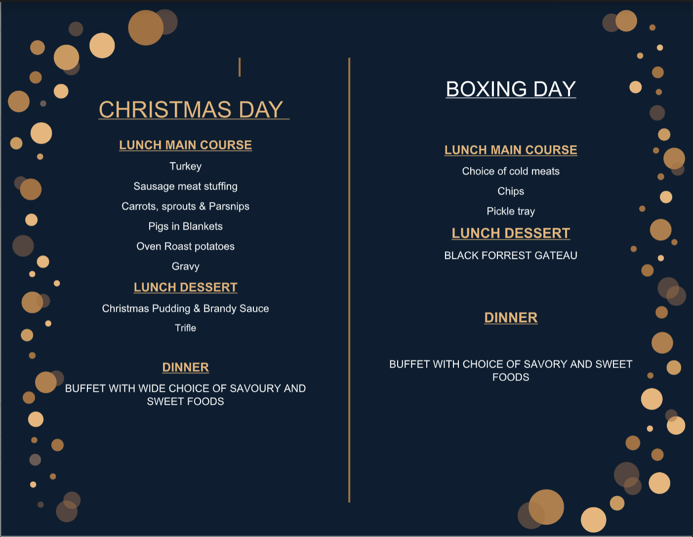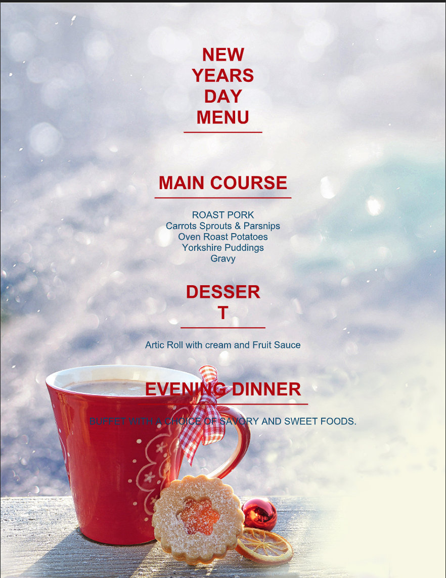 There are a summer and a winter daily menus and an example of a daily menu is shown below and you may have a look at our Daily, Easter Sunday, Christmas and New Years Day menus by clicking on the links: